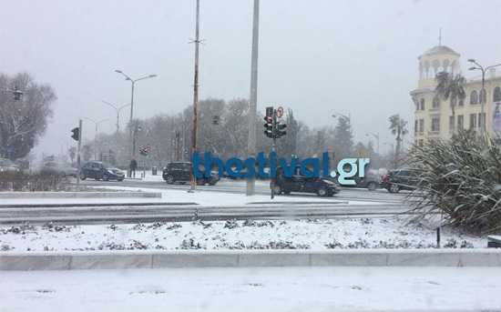 Έντονη είναι η χιονόπτωση στο κέντρο της Θεσσαλονίκης μετά τις 11 το πρωί, με το οδόστρωμαακόμη και κεντρικών οδών, όπως η παραθαλάσσια Λεωφόρος Νίκης, να έχει καλυφθεί το μεσημέρι από χιόνι, με αποτέλεσμα τα οχήματα να κινούνται με σχεδόν μηδενικές ταχύτητες.